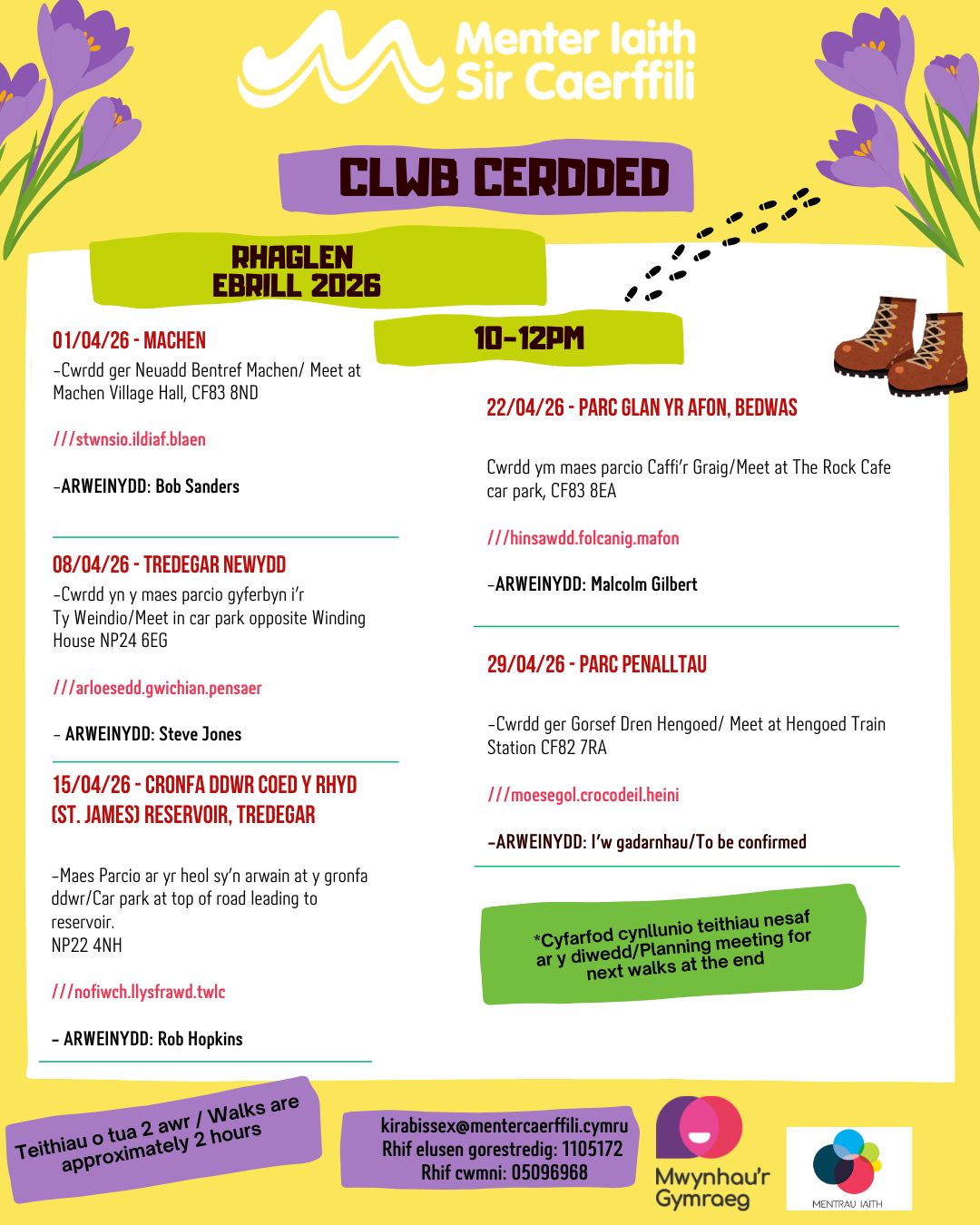 Dewch i fwynhau teithiau cerdded amrywiol bob bore Mercher gyda dysgwyr a siaradwyr Cymraeg eraill.