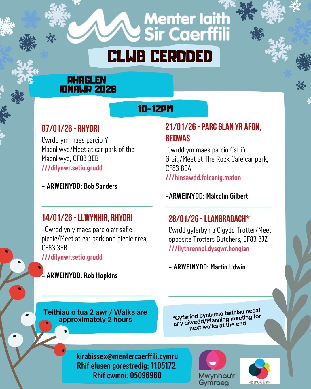 Dewch i fwynhau teithiau cerdded amrywiol bob bore Mercher gyda dysgwyr a siaradwyr Cymraeg eraill.