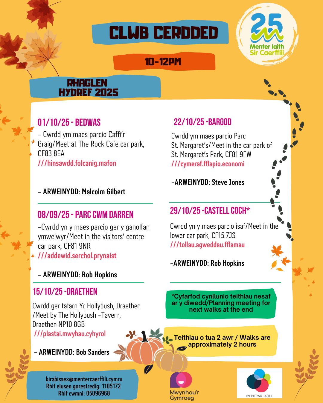 Dewch i fwynhau teithiau cerdded amrywiol bob bore Mercher gyda dysgwyr a siaradwyr Cymraeg eraill.