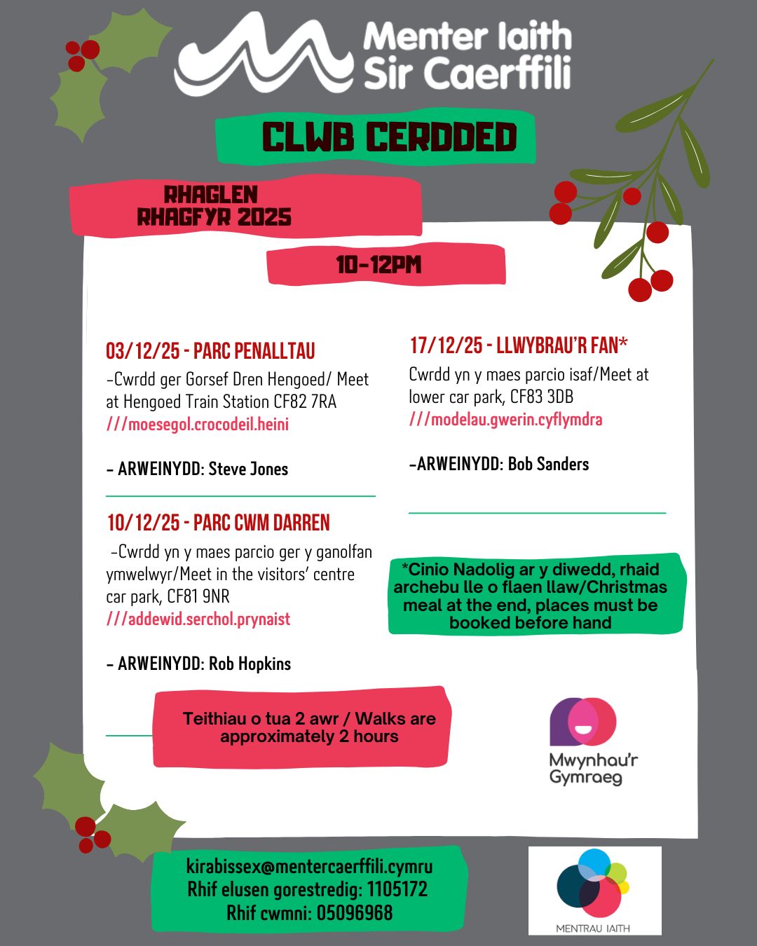 Dewch i fwynhau teithiau cerdded amrywiol bob bore Mercher gyda dysgwyr a siaradwyr Cymraeg eraill.